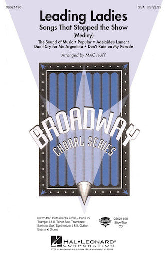 Leading Ladies: Songs That Stopped the ShowPublisher: Hal LeonardCategory: ChoralSeries: Broadway ChoralFormat: CDBring these showstoppers to your audience with this 10-minute medley featuring unforgettable moments from the Broadway stage. Includes: Popular (Wicked), Don't Cry for Me...Regular price $59.99 -