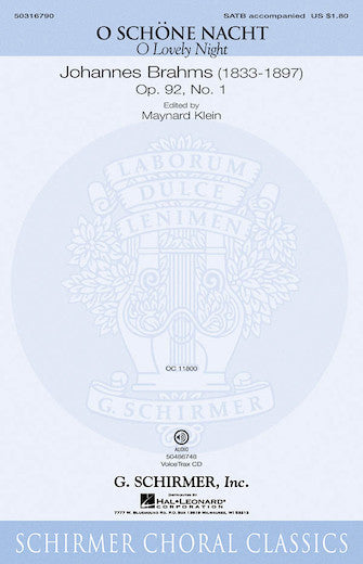 O Schöne Nacht (O Lovely Night)Publisher: SchirmerCategory: ClassicalSeries: ChoralFormat: CDOne of the Brahms' most popular choral works, now newly engraved. Available separately, the VoiceTrax CD features a full performance with vocals, accompaniment only and individual part-predominant...Regular price $20.99 -