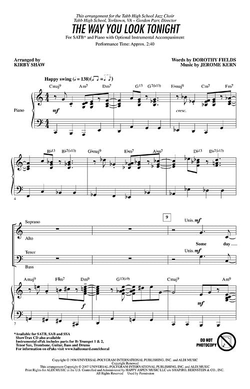 The Way You Look TonightPublisher: Hal LeonardCategory: ChoralSeries: Jazz ChoralsFormat: CDSet in a happy swing tempo, this standard arranged by Kirby Shaw just brims with energy. The vibrant rhythms and full jazz harmonies complete the package.Available...Regular price $35.99 -