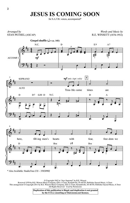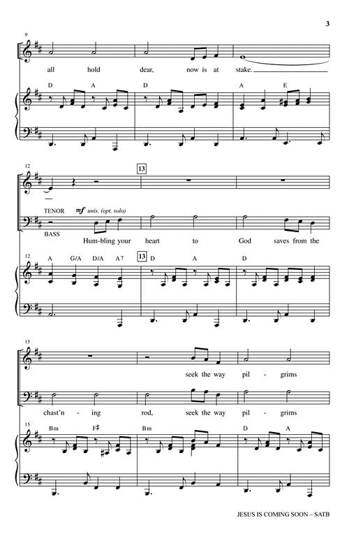 Jesus Is Coming SoonPublisher: Shawnee PressCategory: ChoralSeries: Shawnee SacredFormat: CDUses: Gospel, Revival, Second Advent, Senior Choir Scripture: Matthew 25:13; Luke 21:36; Hebrews 9:29 From the southern gospel Hall of Fame comes a true evergreen. The title...Regular price $32.99 -