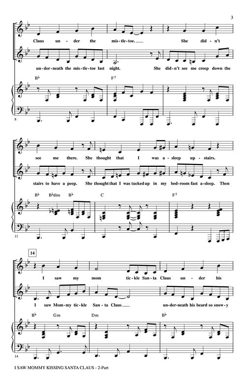 I Saw Mommy Kissing Santa ClausPublisher: Hal LeonardCategory: ChoralSeries: Secular Christmas ChoralFormat: CDHere's the holiday song from the 1950s in a cute setting for younger choirs. Easy partner style countermelodies and some clever back and forth...Regular price $29.99 -