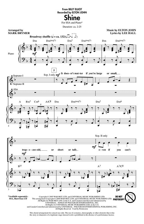 Shine(from Billy Elliot)Publisher: Hal LeonardCategory: ChoralSeries: Broadway ChoralFormat: CDLike the young dancers in Billy Elliot, every young performer must learn the elusive concept of show biz! A great confidence builder for SSA groups! Available separately: SSA,...Regular price $35.99