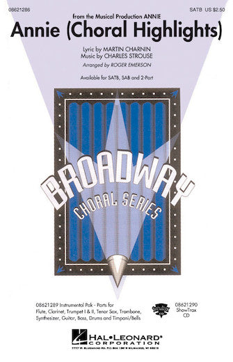 Annie (Choral Highlights)Publisher: Hal LeonardCategory: ChoralSeries: Broadway ChoralFormat: CDShe's America's sweetheart! Perform this delightful 7-minute medley in your next concert. Includes: I Don't Need Anything But You, It's the Hard-Knock Life, Maybe, You're Never Fully Dressed...Regular price $59.99 -