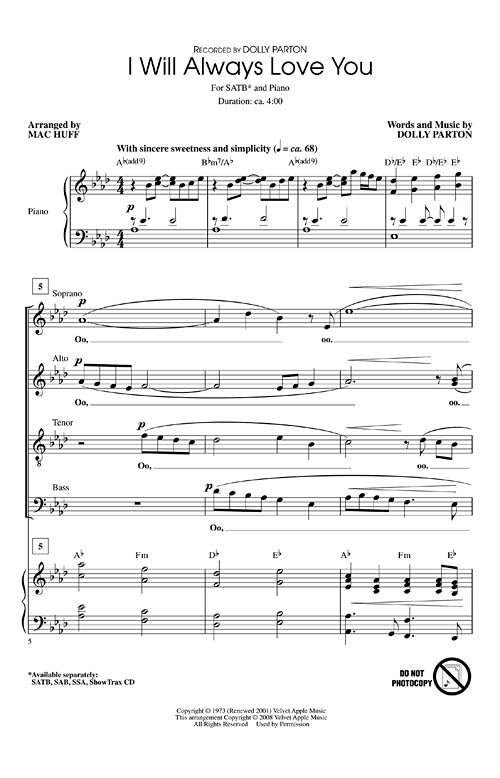 I Will Always Love YouPublisher: Hal LeonardCategory: ChoralSeries: Pop Choral SeriesFormat: CDThis is the song that secured Dolly Parton's place in both country and pop music history! Simple, direct and powerful in its emotional impact, this...Regular price $29.99