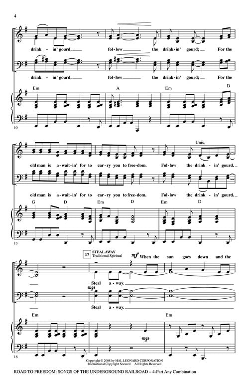 Road to Freedom: Songs of the Underground RailroadPublisher: Hal LeonardCategory: ChoralSeries: World Music DrummingFormat: CDThis arrangement of two Underground Railroad songs presents a good opportunity to experience the important historical period before the abolition of slavery....Regular price $29.99 -