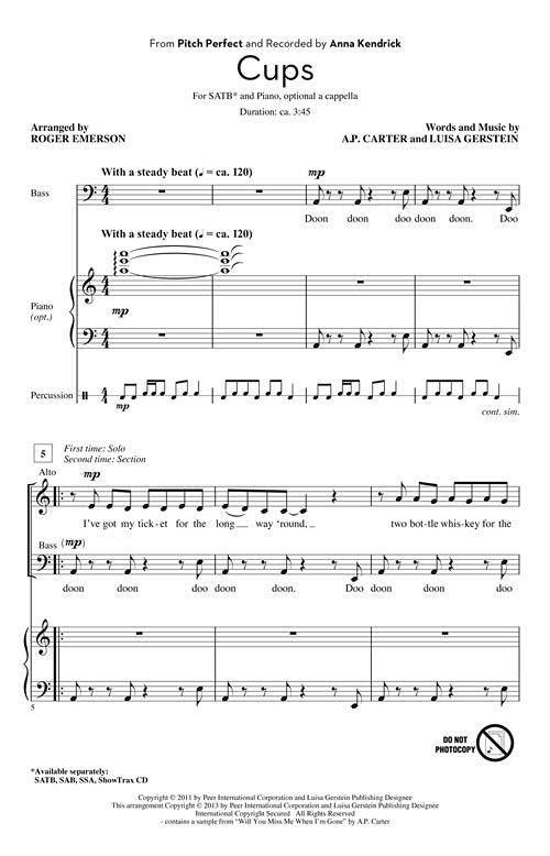 Cups(from Pitch Perfect)Publisher: Hal LeonardCategory: ChoralSeries: Pop Choral SeriesFormat: CDShowTrax CD for Cups from the motion picture Pitch Perfect.Inventory # : 00119825UPC: 884088913250ISBN: Width: 5"Length: 5"Height: 0.115"Product Weight: 0.1 lbs.Number of Pages: Condition: New Item# 00119825...Regular price $35.99 -