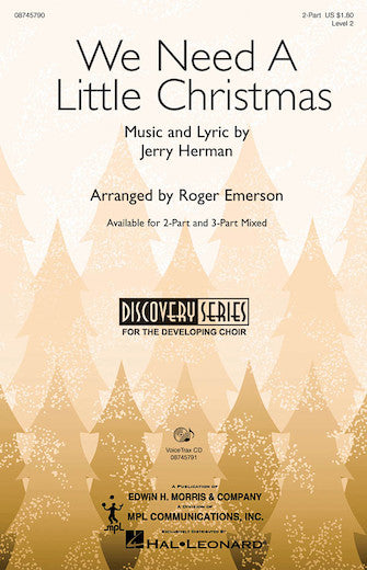 We Need a Little Christmas(from Mame)Publisher: Hal LeonardCategory: ChoralSeries: Discovery Christmas ChoralFormat: CDFrom Mame, this holiday classic will lift your spirits to the rafters! Easily learned and effective in all your December programs! Discovery Level 2.Available...Regular price $35.99 -