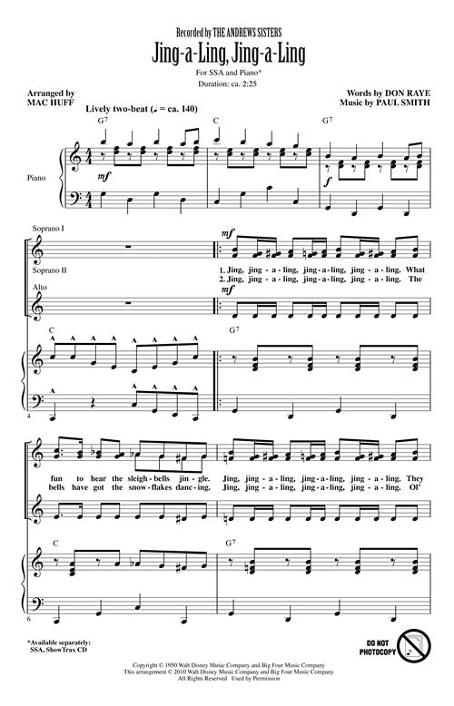 Jing-a-Ling, Jing-a-LingPublisher: Hal LeonardCategory: ChoralSeries: Secular Christmas ChoralFormat: CDYou'll have a sleighride full of merriment with this bright and cheery song recorded by the Andrews Sisters that will be especially fun for your SSA groups! Great...Regular price $32.99 -