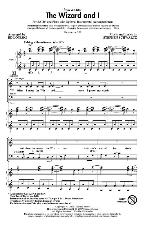 The Wizard and I(from Wicked)Publisher: Hal LeonardCategory: ChoralSeries: Broadway ChoralFormat: CDThe Broadway hit Wicked continues to enchant audiences all across the country. In this song, Elphaba dreams of the life before her and her dreams for...Regular price $27.99