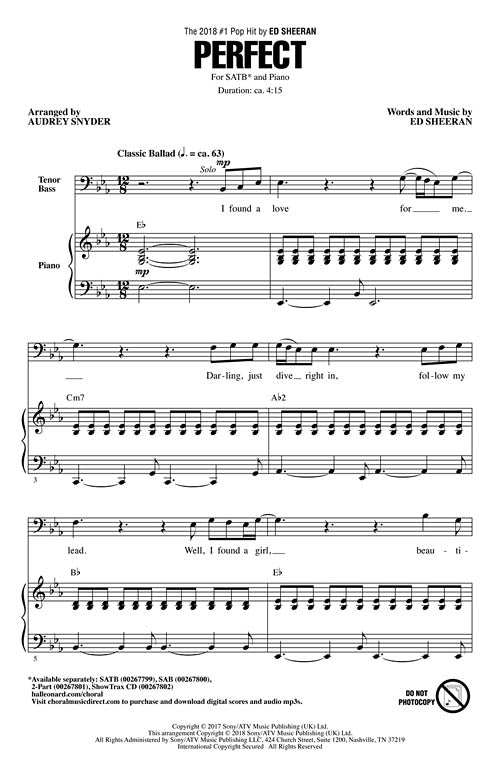 PerfectPublisher: Hal LeonardCategory: ChoralSeries: Pop Choral SeriesFormat: CDThe stand-out ballad from Ed Sheeran's album Divide is a love song for the ages. Sung as duets with both Beyoncé and Andrea Bocelli, the song catapulted to #1....Regular price $32.99
