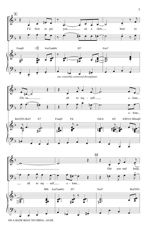 On a Slow Boat to ChinaPublisher: Hal LeonardCategory: ChoralSeries: Jazz ChoralsFormat: CDSet in a medium swing, this jazz standard cooks from start to finish! Opening with unison vocals, it moves to two-part, then four-part jazz chords...Regular price $32.99 -