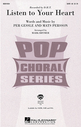 Listen to Your HeartPublisher: Hal LeonardCategory: ChoralSeries: Pop Choral SeriesFormat: CDThe Belgian duo D.H.T. burst onto the Billboard charts with this remake of the classic 1980's Roxette favorite.Available separately: SATB, SAB, SSA and ShowTrax CD. Performance...Regular price $27.99 -