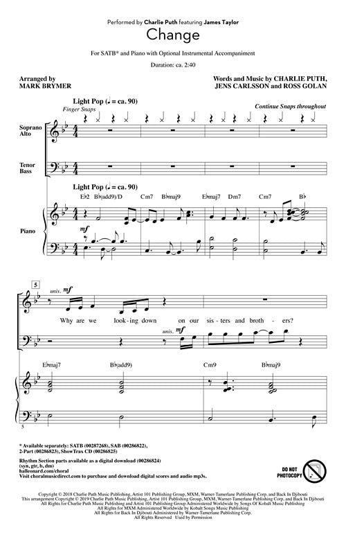 ChangePublisher: Hal LeonardCategory: ChoralSeries: Pop Choral SeriesFormat: CDWritten a year prior, but released as a response to the Stoneman Douglas High School tragedy in Parkland, Florida, Charlie Puth dubs this 2018 collaboration with James Taylor as...Regular price $32.99