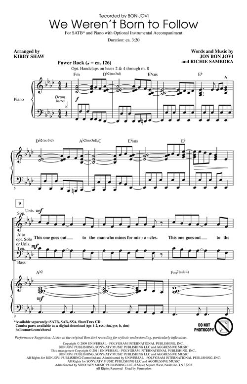 We Weren't Born to FollowPublisher: Hal LeonardCategory: ChoralSeries: Pop Choral SeriesFormat: CDFrom the Bon Jovi album The Circle, this 2009 single evokes themes of working people picking themselves up by their bootstraps in hard times. This...Regular price $32.99 -