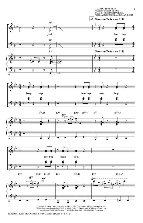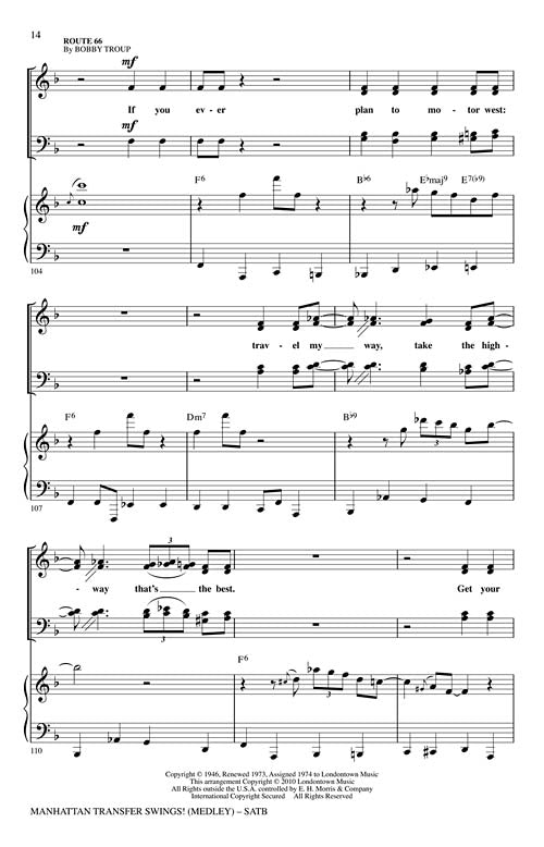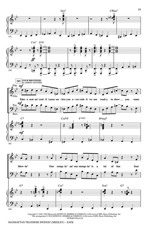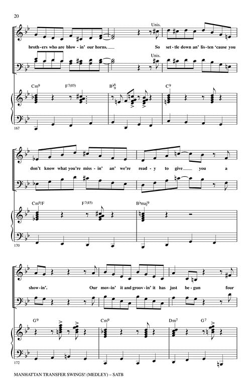 Manhattan Transfer Swings!(Medley)Publisher: Hal LeonardCategory: ChoralSeries: Jazz ChoralsFormat: CDFour of Manhattan Transfer's signature songs are showcased here in a 6-minute mini-medley that will totally energize your concert! Includes: Four Brothers, Route 66, That Cat Is High,...Regular price $59.99 -