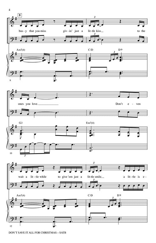 Don't Save It All for Christmas DayPublisher: Shawnee PressCategory: ChoralSeries: Shawnee PressFormat: CDCovered by many artists, this song was co-written and first recorded by Celine Dion on her first English-language holiday album, These Are the Special...Regular price $32.99 -