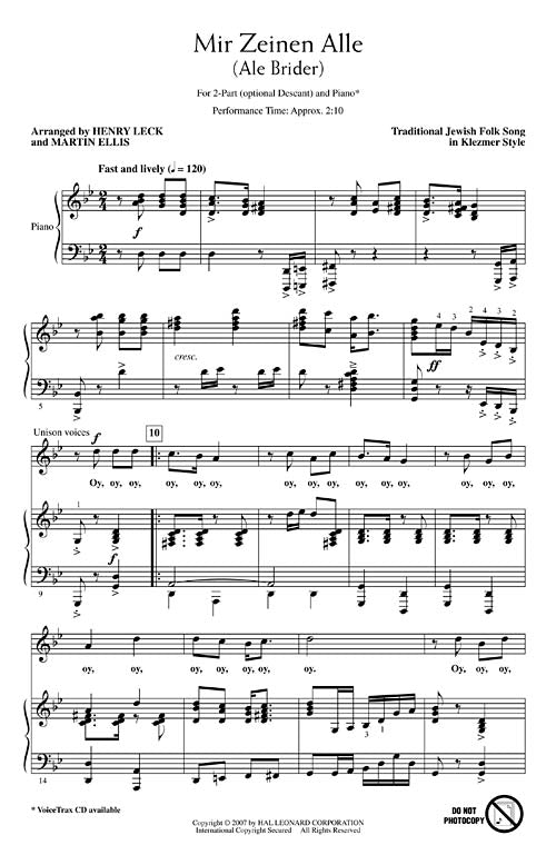 Mir Zeinen Alle(Ale Brider)Publisher: Hal LeonardCategory: ChoralSeries: Henry Leck Creating ArtistryFormat: CDThis fast and lively setting of the traditional Jewish song will be a wonderful and joyous finale for many concerts. We're all brothers, singing joyous...Regular price $17.99