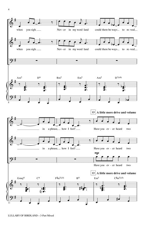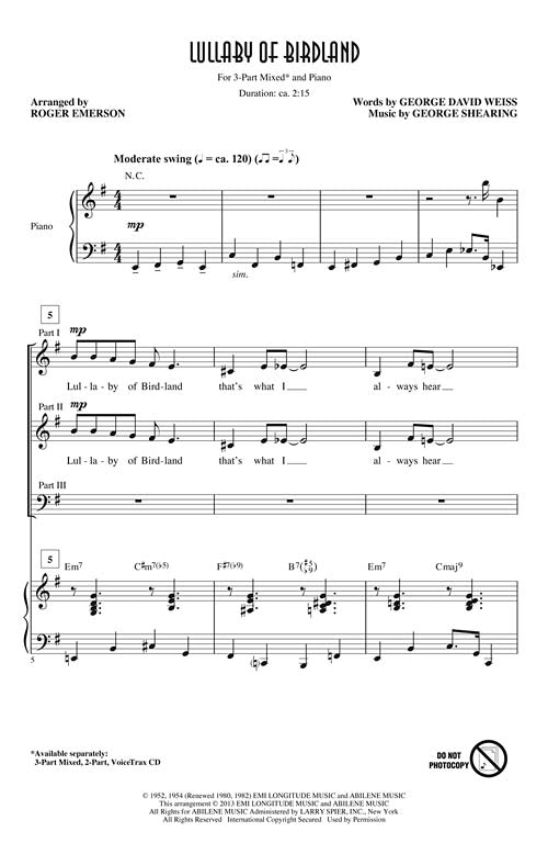 Lullaby Of BirdlandDiscovery Level 3Publisher: Hal LeonardCategory: ChoralSeries: Discovery ChoralFormat: CDIntroduce your young choir to this famous jazz classic! Set in an easy swing with great part-writing and craftsmanship! Available separately: 3-Part Mixed, 2-Part, VoicTrax CD....Regular price $32.99 -
