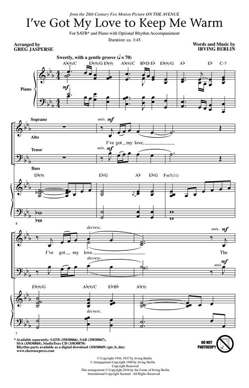 I've Got My Love to Keep Me WarmPublisher: Shawnee PressCategory: ChoralSeries: Shawnee PressFormat: CDIrving Berlin's classic is presented here in a gentle, sweet groove with simple jazz vocals and soft rhythm. Beginning with an easy vocal...Regular price $32.99 -