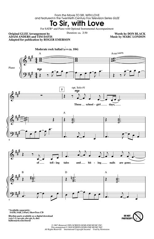 To Sir, with Love(featured in Glee)Publisher: Hal LeonardCategory: ChoralSeries: Pop Choral SeriesFormat: CDThe first season of Glee closed with a well-deserved tribute to Glee Club director Will Schuester - and indeed to music teachers everywhere -...Regular price $32.99