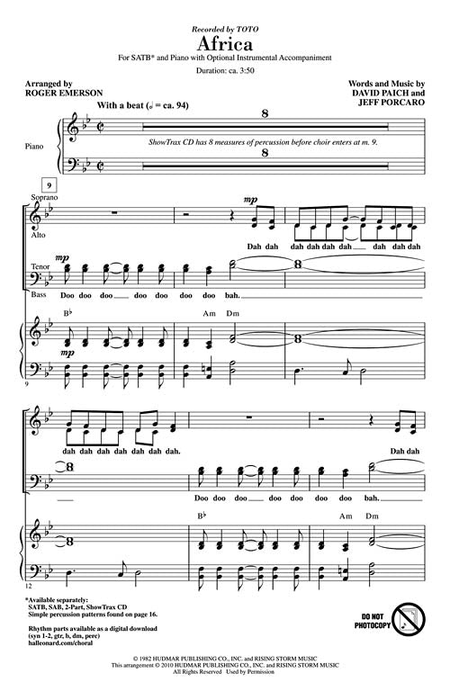 AfricaPublisher: Hal LeonardCategory: ChoralSeries: Pop Choral SeriesFormat: CDMillions saw the amazing You Tube performance of Toto's Africa by the Slovenian choir Perpetuum Jazzille as they recreated the sounds of a rainstorm solely with body percussion. This...Regular price $32.99 -