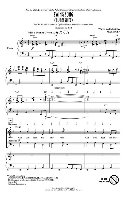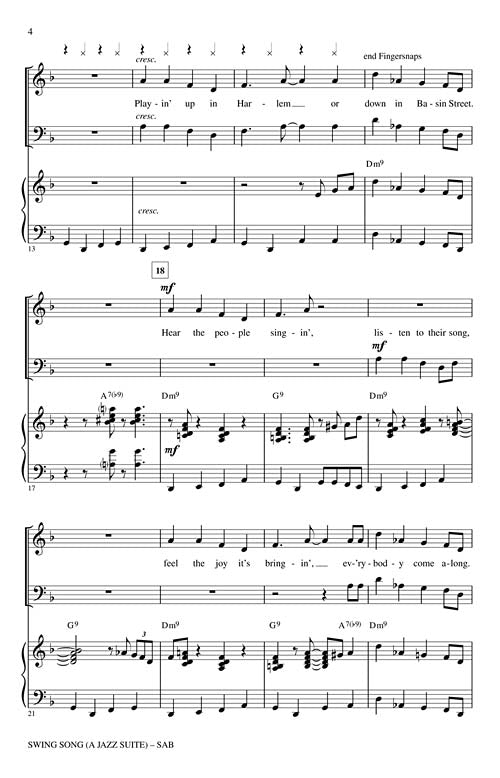 Swing Song (A Jazz Suite) Discovery Level 2 CD ShowTrax CD Here is an original jazz suite that is perfectly suited to treble choirs or developing mixed groups in middle school and high school. The lyrics...Regular price $32.99 -