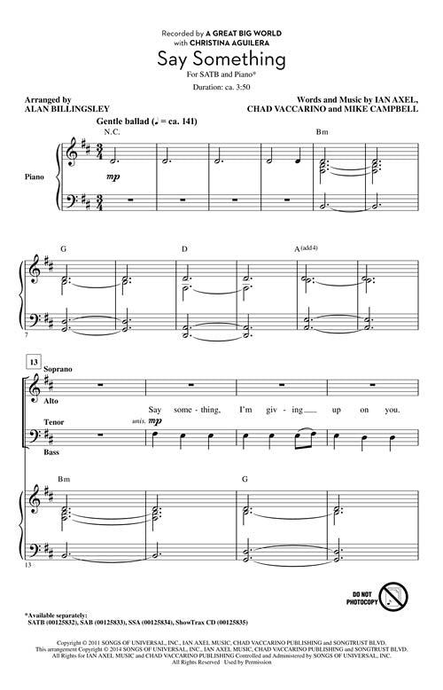 Say Something CD ShowTrax CD From the duo A Great Big World with Christina Aguilera, this emotional ballad immediately connects with the listener as the lyrics reflect on the break-up of a relationship through beautiful, aching...Regular price $35.99 -