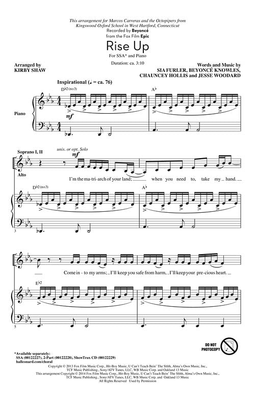 Rise Up (from Epic) CD ShowTrax CD Be who you are is the uplifting message of this song by Beyoncé from the soundtrack to the film Epic. An inspirational selection for choirs of all levels! Inventory...Regular price $32.99 -