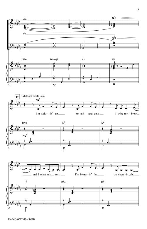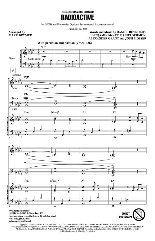 Radioactive CD ShowTrax CD Imagine Dragons topped the charts with this pounding alt-rock hit, offered here evoking the mesmerizing vocal version by the group Pentatonix with violin. Stark lyrics over a pulsing pop groove make this...Regular price $32.99 -