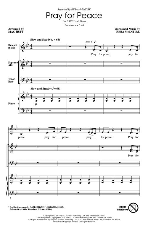 Pray for Peace CD ShowTrax CD The powerful recurring refrain of Pray for peace is the heart of this anthem-like song from Reba McEntire. With a powerful underlay and layered harmonies, this is a wonderful work...Regular price $32.99 -