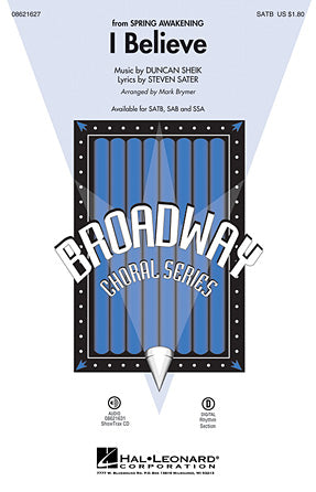 I Believefrom Spring AwakeningPublisher: Hal LeonardCategory: ChoralSeries: Broadway ChoralFormat: CDWinner of eight Tony Awards, Spring Awakening has touched a strong chord especially with young audiences through its vivid and emotional score and story. Closing Act I,...Regular price $32.99 -