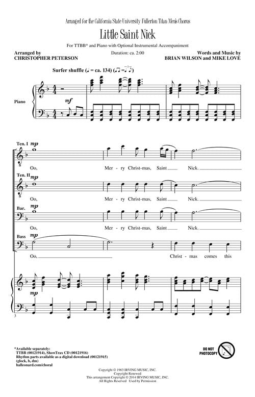 Little Saint Nick CD ShowTrax CD You will have fun, fun, fun with this 1963 holiday classic by the Beach Boys! A great concert showcase for men's choirs and close harmony groups! Inventory # : 00121916...Regular price $35.99 -
