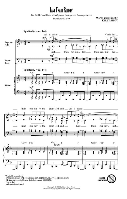 Last Train Runnin' CD ShowTrax CD Set in an up-tempo gospel style with energetic rhythms, call and response vocal lines and a driving accompaniment, this original spiritual is just the ticket for a fantastic choral showcase!...Regular price $32.99 -