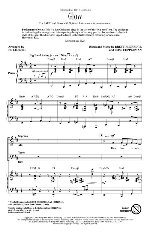 Glow CD ShowTrax CD Nashville artist Brett Eldridge brings a big band production and Sinatra-style vocals to this 2016 holiday release that celebrates the warmth and glow of the season. A fabulous showcase for pop, show...Regular price $32.99 -
