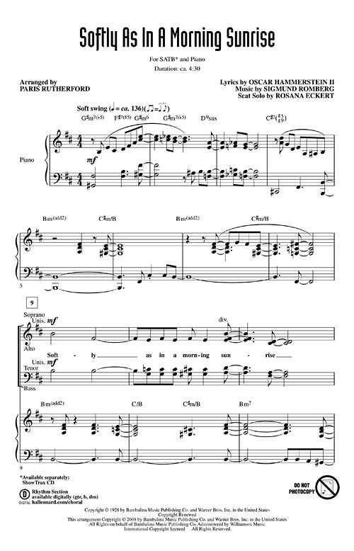 Softly as in a Morning SunrisePublisher: Hal LeonardCategory: ChoralSeries: Jazz ChoralsFormat: CDThis popular jazz standard, recorded by dozens of artists, is a perfect vehicle for displaying your group's facility and creativity. An excellent selection for all...Regular price $29.99 -