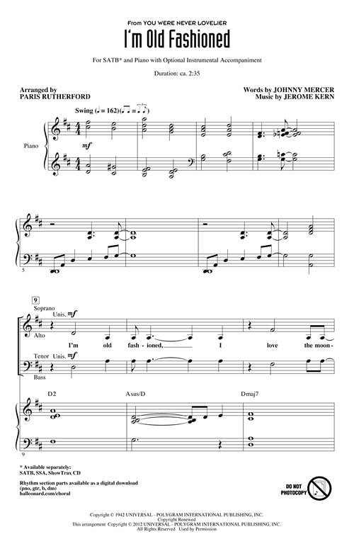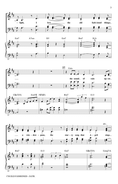 I'm Old FashionedPublisher: Hal LeonardCategory: ChoralSeries: Jazz ChoralsFormat: CDOpening with bright bell tones, this Johnny Mercer/Jerome Kern standard moves into a laid back verse with interesting interplay between the vocals and the band. The walking bass...Regular price $32.99