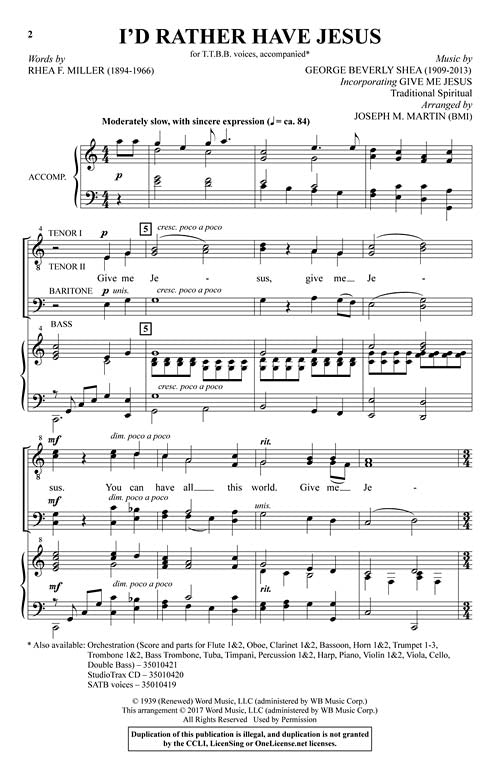 I'd Rather Have Jesus(with Give Me Jesus)Publisher: Shawnee PressCategory: ChoralSeries: Shawnee SacredFormat: CDHere is a thoughtful arrangement of one of the most enduring sacred songs of all time. Choirs of every size and ability will sound...Regular price $35.99 -