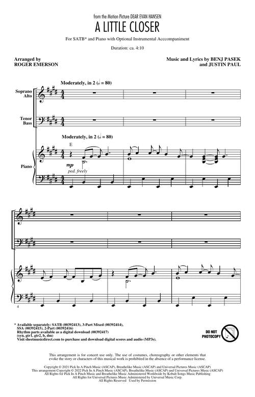 A Little Closer Satb Pop Choral Series Benj Pasek