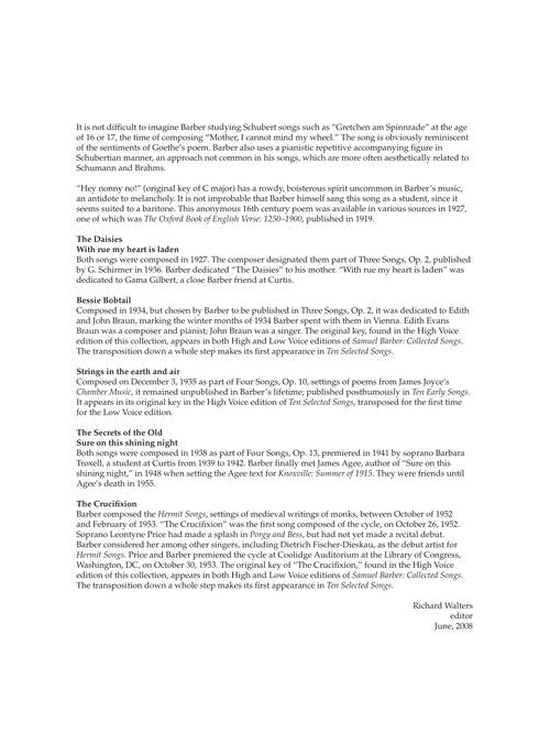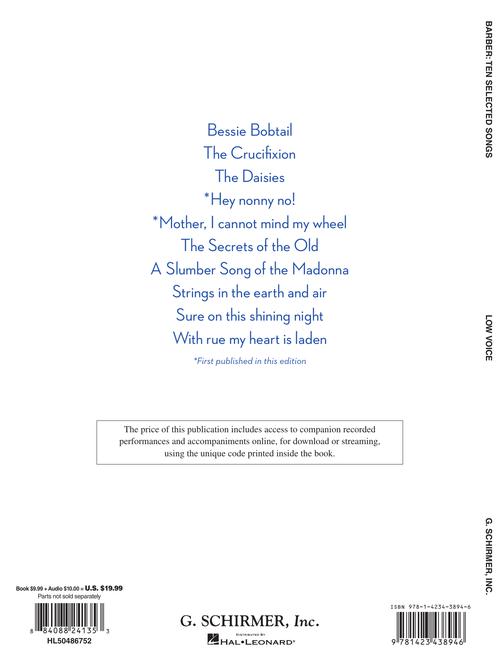 10 Selected SongsLow Voice Book/Online Audio PackPublisher: G. Schirmer, Inc.Category: VocalSeries: VocalFormat: Softcover Audio Onlinewith access to online audio of performances and accompaniments Includes the first ever publication and recording of two early songs: Mother, I...Regular price $27.99 -