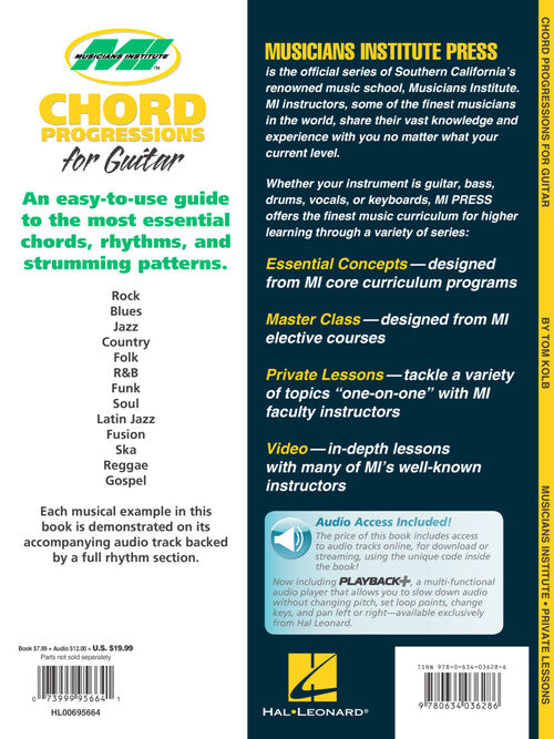 Author: Tom Kolb Chord Progressions for Guitar Private Lessons Series Publisher: Musicians Institute Press Category: Guitar, Bass & Fretted Series: Musicians Institute Press Format: Softcover Audio Online Guitar Tab: YES This private lesson with MI instructor...Regular price $27.99 -