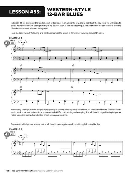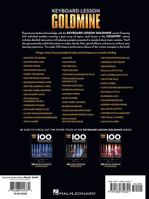 Author: Dan Geisler 100 Country Lessons Keyboard Lesson Goldmine Series Book/2-CD Pack Softcover with CD Expand your keyboard knowledge with the Keyboard Lesson Goldmine series! The series contains four books: Blues, Country, Jazz, and Rock. Each...Regular price $29.99 -