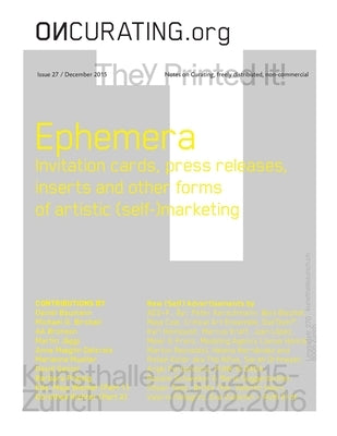 Title: On-Curating Issue 27: Ephemera: Invitation cards, press releases, inserts and other forms of artistic (self-)marketingEditor: Richter, DorotheePublisher: Createspace Independent Publishing PlatformBinding: PaperbackPages: 94Dimensions: 11.00h x 8.50w x 0.24dProduct Weight: 0.71 lbs.Language: EnglishISBN: 9781522801894This 27th issue...Regular price $22.99 -