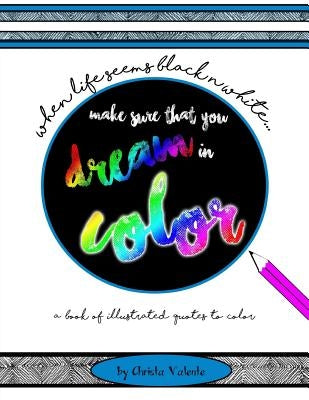 Title: When Your Life Seems Black n White Make Sure That You Dream in Color: a book of illustrated quotes to colorIllustrator: Valente, ChristaPublisher: Createspace Independent Publishing PlatformBinding: PaperbackPages: 46Dimensions: 11.02h x 8.50w x 0.10dProduct Weight:...Regular price $10.99 -