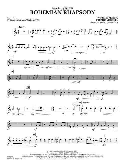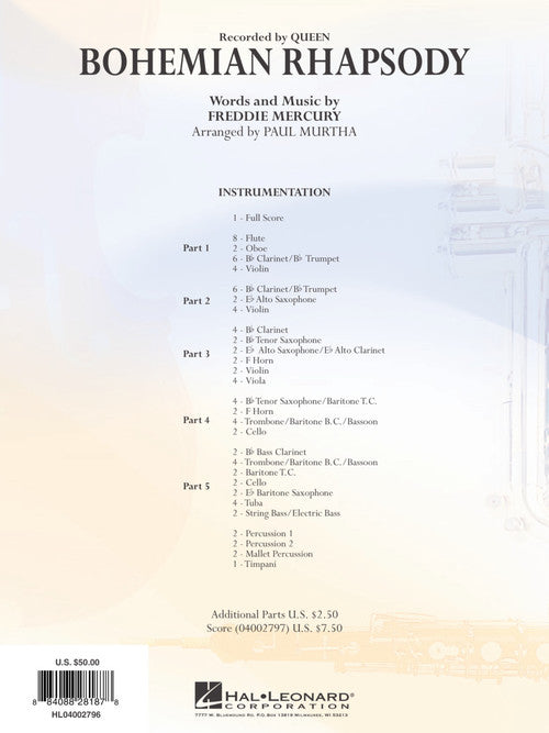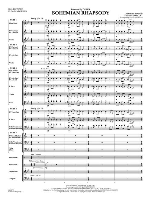 Almost a complete concert in itself, this familiar Queen classic never fails to bring down the house! Hal Leonard's innovative Flex-Band series is designed to provide exciting music for bands with incomplete or unbalanced instrumentation. Written using just five parts (plus percussion), these arrangements will work with virtually ANY combination of brass or woodwinds - even strings. Dur: 4:00