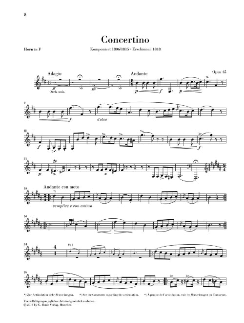 The horn is surely the most romantic of instruments, and it is a well-known fact that it plays a prominent role in Weber's oeuvre. Der Freischütz and Oberon would be unthinkable without their horn calls, whether to signify yearning or the clarion call of the hunt. But Weber did more than give the instrument important solo parts in his operas; he also wrote a virtuoso concert piece that to this day is regarded as one of the most difficult in the whole horn repertoire - not least because the soloist has to play three-part chords (!) in the cadenza. This Henle Urtext edition is based on the autograph, the engraver's copy (checked by Weber himself) and the first edition, and so offers the best possible musical text for those wishing to learn this highly effective virtuoso piece. The Preface also for the first time provides biographical details of Sebastian Rauch, the Munich horn player who commissioned this Concertino.