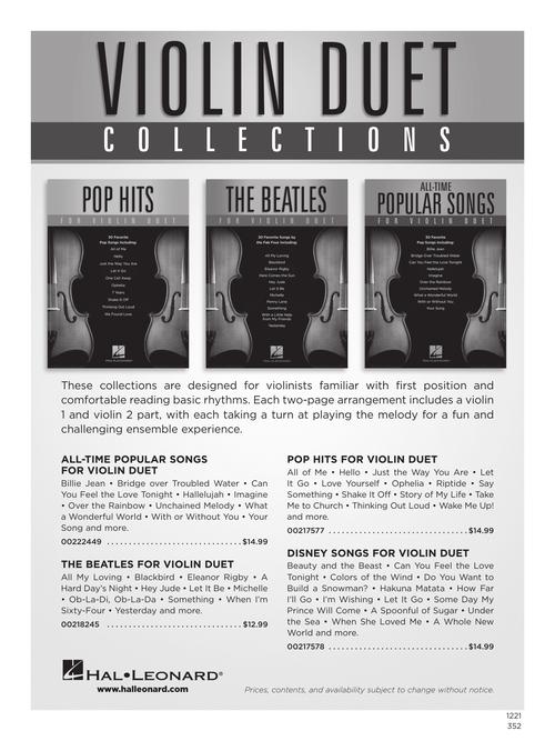 Classical Themes for Violin Duet is designed for violinists familar with first position and comfortable reading basic rhythms. In each two-page arrangement, violin 1 and violin 2 take a turn playing the melody for a fun and challenging ensemble experience. It includes 30 well-loved melodies by J.S. Bach, Beethoven, Debussy, Gershwin, Grieg, Liszt, Mussorgsky, Tchaikovsky, Vivaldi, Wagner, and more.