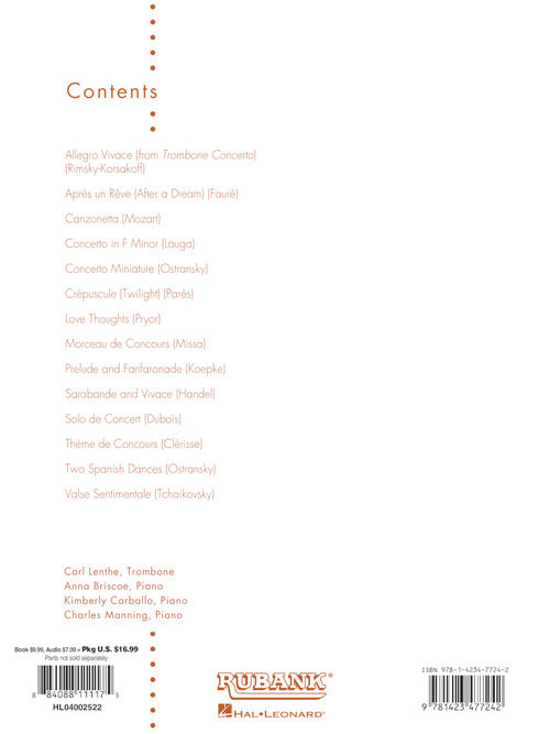Concert and Contest Collection for Trombone Solo Book with Online Media Publisher: Hal Leonard Category: Band/Orchestra/Ensemble Series: Rubank Book/Audio Products Format: Softcover Media Online This top-rated collection of solo literature from the celebrated Rubank catalog is known by teachers and students everywhere. Each book offers a superb variety of solos customized for that instrument, and most state solo/ensemble contest lists include several solos from this collection. In addition to the solo book, this item includes online access to: · Full-performance and accompaniment-only audio tracks · PDF piano accompaniment - download and print only what you need · PLAYBACK+ A multi-function audio player that allows you to adjust tempo without changing pitch, change keys, and create practice loops - available exclusively from Hal Leonard. Online audio/media is accessed at halleonard.com/mylibrary (http://www.halleonard.com/mylibrary) Contents: Allegro Vivace from Concerto for Trombone (Rimsky-Korsakov) · Après un Rêve (After a Dream) (Faure) · Canzonetta (Mozart) · Concerto in F Minor (Lauga) · Concerto Miniature (Ostransky) · Crépuscule (Twilight) (Faure) · Love Thoughts (Pryor) · Morceau de Concours (Missa) · Prelude and Fanfaronade (Koepke) · Sarabande and Vivace (Handel) · Solo de Concert (Dubois) · Thème de Concours (Clérisse) · Two Spanish Dances (Ostransky) · Valse Sentimentale (Tchaikovsky). Also available: · Solo Book only (HL04471790) · Piano Accompaniment Book (HL04471800) Inventory # : 04002522 UPC: 884088111175 ISBN: 1423477243 Width: 9" Length: 12" Height: 0.134" Product Weight: 0.3 lbs. Number of Pages: 24