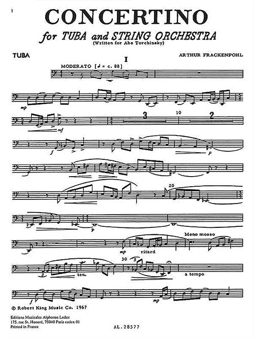 American composer Arthur Frackenpohl (b. 1924) has written a significant amount of successful repertoire for the brass family. Concertino for tuba and piano reduction is no exception. Frackenpohl has won multiple awards for his compositions. Published in 1967, Concertino for tuba added a significant work to the repertoire of an instrument which lacks in substantial solo compositions. Comprising three movements, the first movement of Concertino is marked moderato, followed by a lento second movement. The final movement is allegro. All three movements display fine aspects of the tuba which are often ignored. Suitable for intermediate tuba players, Frackenpohl's Concertino for the instrument is an exciting addition to the instrument's repertoire.