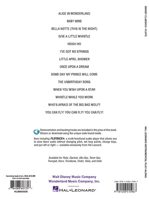 Play along with 14 timeless Disney favorites, including: Alice in Wonderland · Bella Notte (This Is the Night) · Give a Little Whistle · Heigh-Ho · Little April Shower · Once upon a Dream · Some Day My Prince Will Come · When You Wish upon a Star · Whistle While You Work · You Can Fly! You Can Fly! You Can Fly! · and more. The audio is accessed online using the unique code inside each book and can be streamed or downloaded. The audio files include PLAYBACK+, a multi-functional audio player that allows you to slow down audio without changing pitch, set loop points, change keys, and pan left or right.