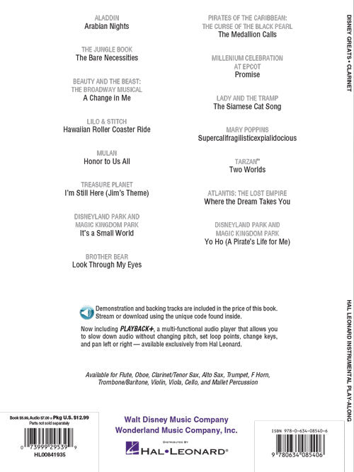 Another great play-along collection of 15 Disney favorites, including: Arabian Nights · A Change in Me · Hawaiian Roller Coaster Ride · I'm Still Here (Jim's Theme) · It's a Small World · Look Through My Eyes · Supercalifragilisticexpialidocious · Where the Dream Takes You · Yo Ho (A Pirate's Life for Me) · and more. The accompanying audio is accessed through Hal Leonard's popular MyLibrary system using the provided code. The audio can be streamed or downloaded and includes PLAYBACK+, a multi-functional audio player that allows you to slow down audio without changing pitch, set loop points, change keys, and pan left or right.